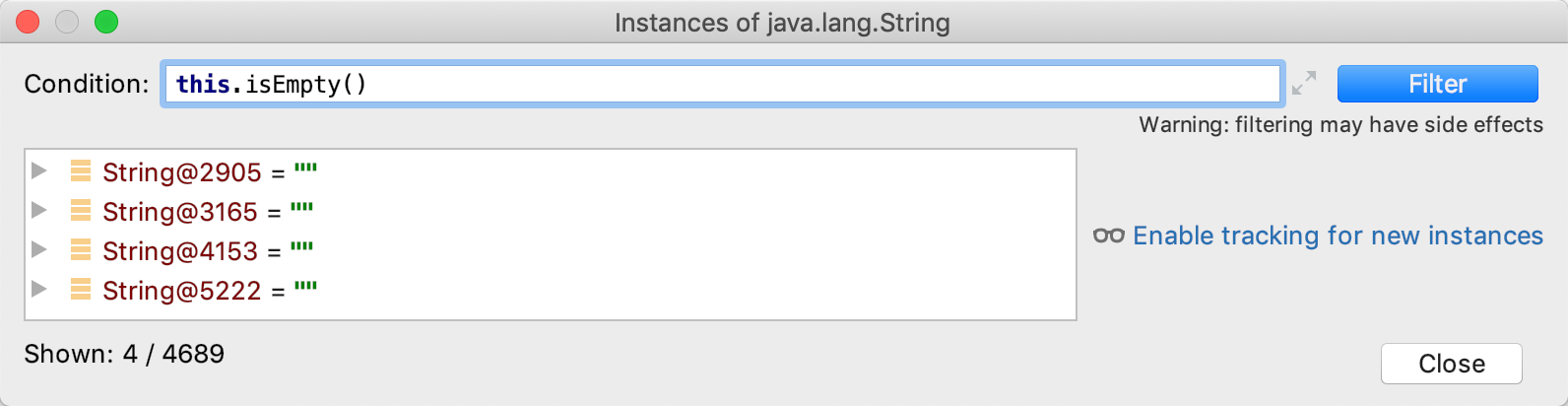 String对象的列表,请双击“内存”选项卡上的“字符串” ,然后在“条件”字段中输入。this.isEmpty()
