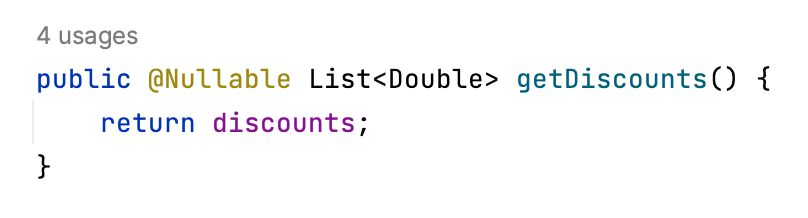 IntelliJ IDEA 可以推断以下JetBrains 注释:@Nullable、@NotNull、@Contract、@Unmodifiable和@UnmodifiableView。有关此注释风格的完整文档,请参阅包源代码。