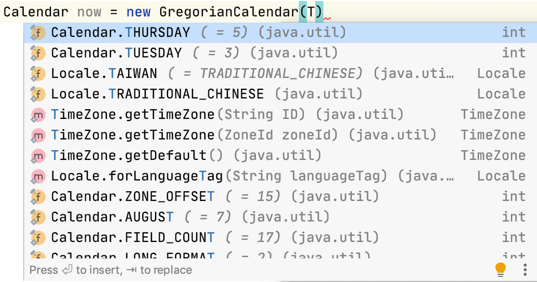 开始输入名字。默认情况下,IntelliJ IDEA 在您键入时自动显示代码完成弹出窗口。