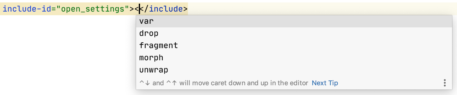 标签和属性名称的完成基于与文件关联的DTD 或架构。如果没有模式关联,IntelliJ IDEA 将使用文件内容(标签和属性名称及其值)来完成您的输入。