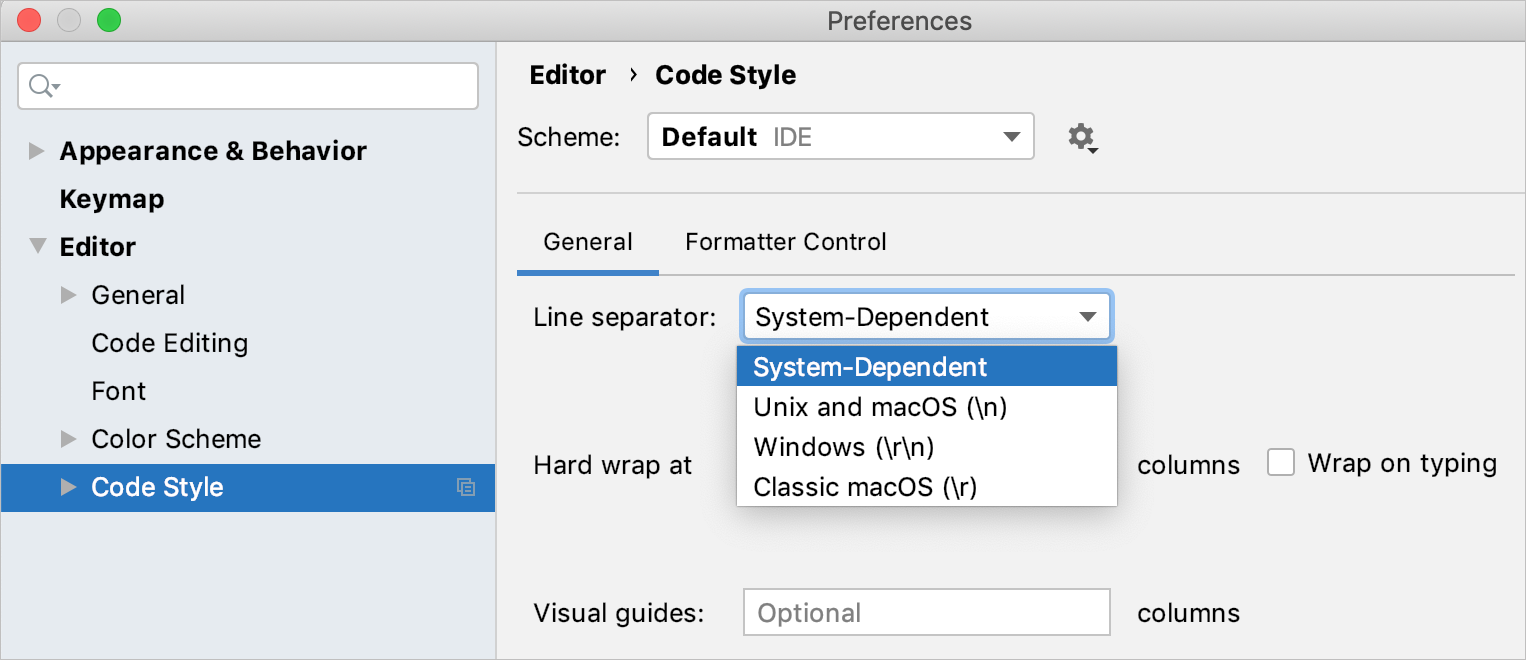 使用 IntelliJ IDEA,您可以为新创建的文件设置行分隔符(行结尾),并更改现有文件的行分隔符样式。