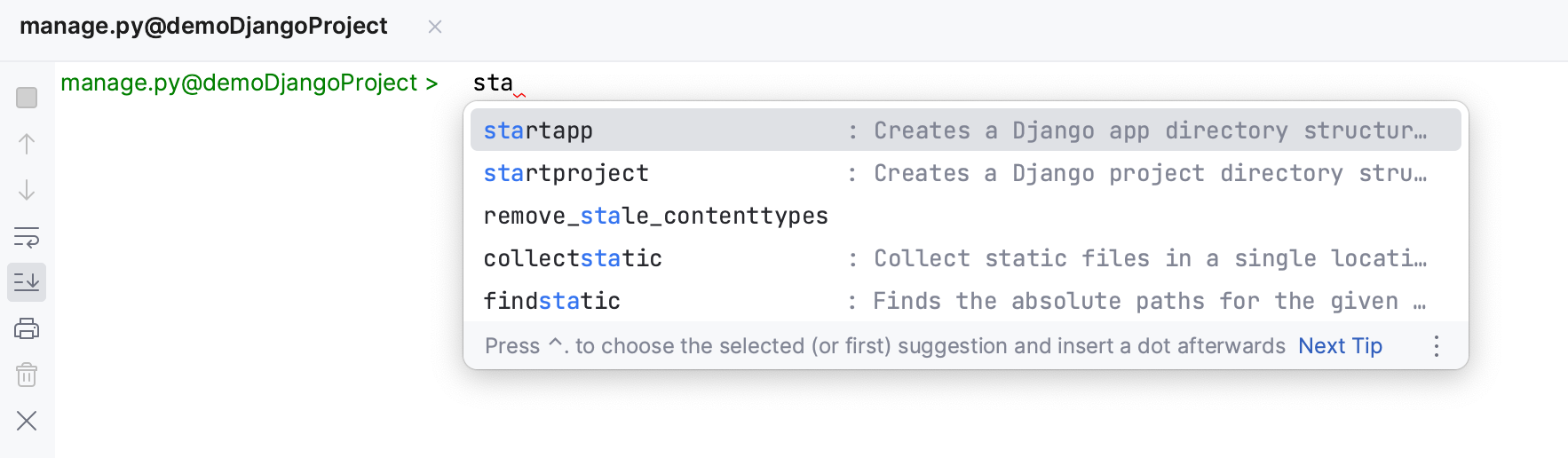 非 JVM 技术PythonDjango 支持在项目中创建 Django 应用程序最终的在项目中创建 Django 应用程序最后修改时间:2023年9月7日 警告以下仅在安装并启用Python插件时有效。相当于将新站点添加到现有 Django 项目,请使用manage.pystartapp实用程序的任务。 将新的 Django 应用程序添加到现有项目 转到工具|运行manage.py任务在Django 控制台对话框中,输入startapp。请注意在对话框下方的建议列表中输入第一个字母后出现,并在您键入时缩小以仅显示完全匹配。输入新 Django 应用程序的名称。检查项目结构。您应该看到为新注册的应用程序创建的目录和专用文件。 感谢您的反馈意见!此页面是否有帮助?是的不