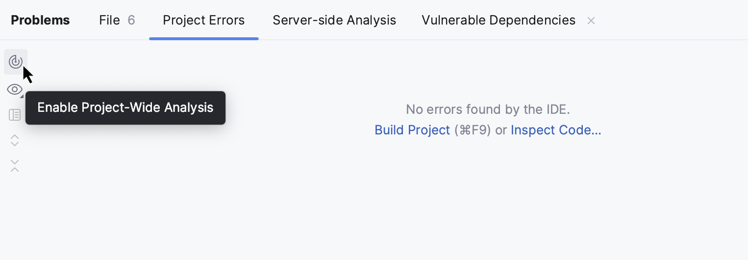 当禁用项目范围的分析时,“问题”工具窗口的“项目错误”选项卡将显示最新构建的结果。