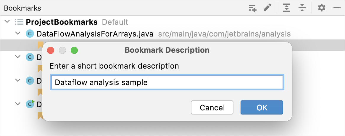 书签有简短的描述。默认情况下,它们包含行的代码或放置它们的项目的名称。如有必要,您可以为书签提供您自己的简短描述。