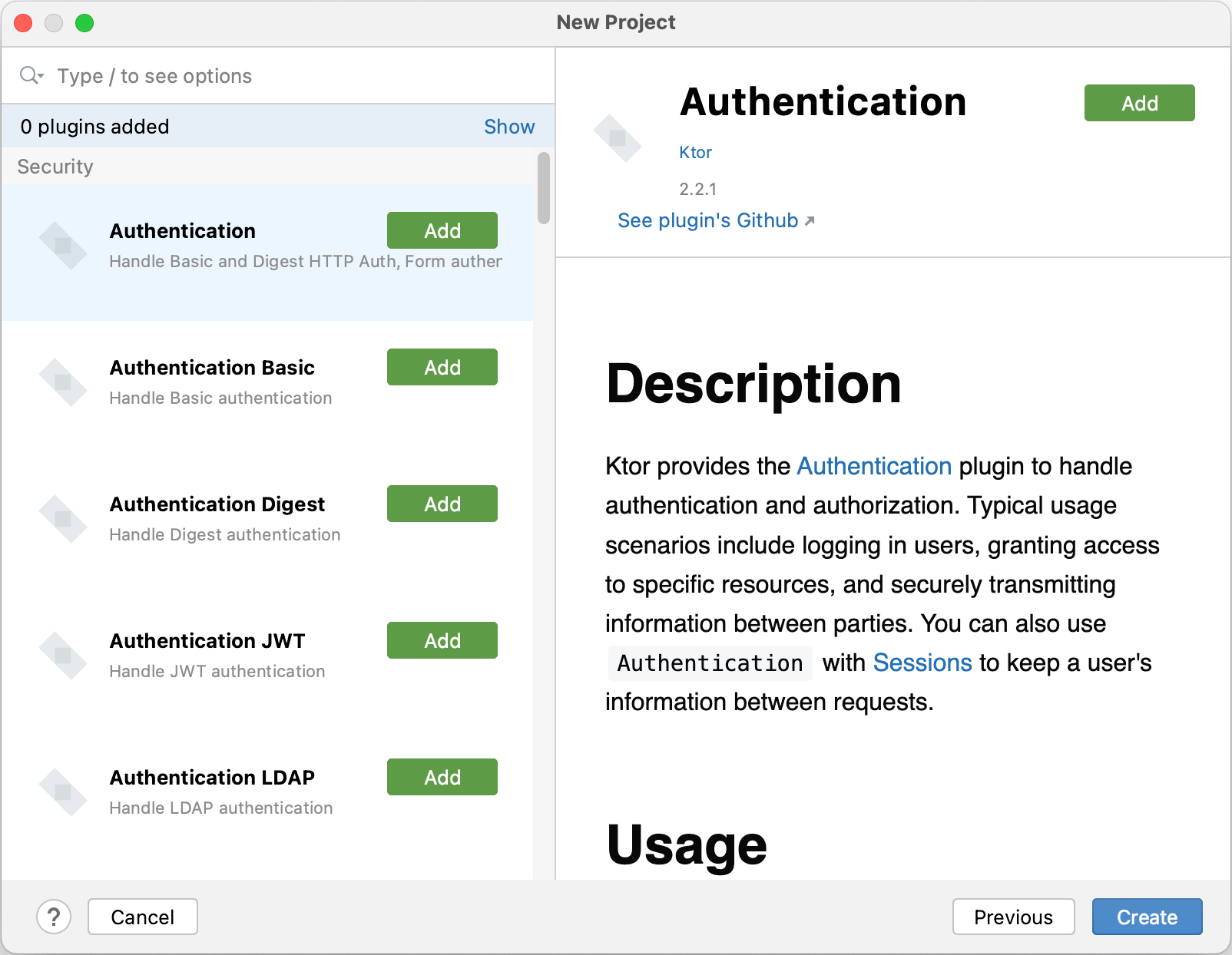 在下一页上,您可以选择一组插件- 提供 Ktor 应用程序常见功能的构建块,例如身份验证、序列化和内容编码、压缩、cookie 支持等。