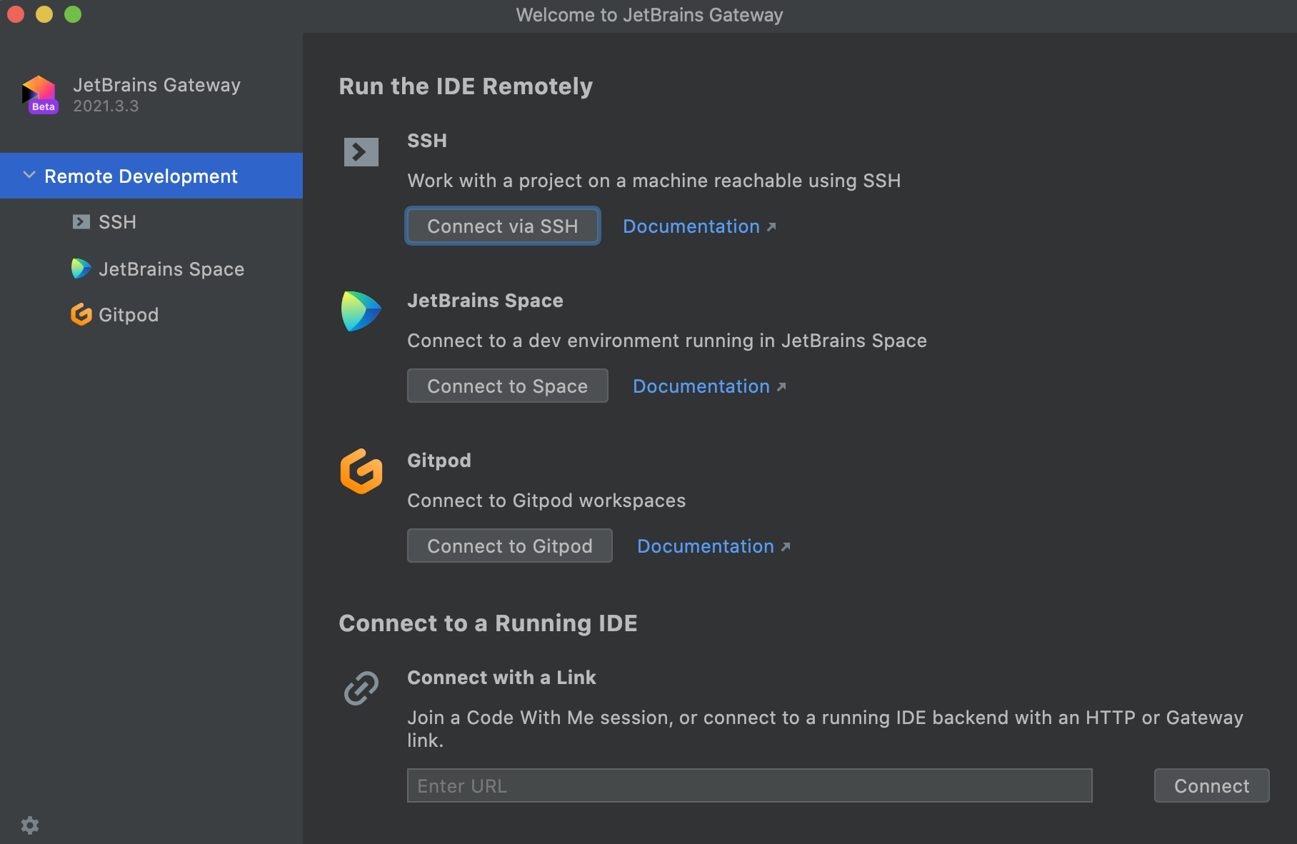 您还可以单击“通过链接连接”并输入之前生成的链接,以连接到“Code With Me”会话或远程服务器。