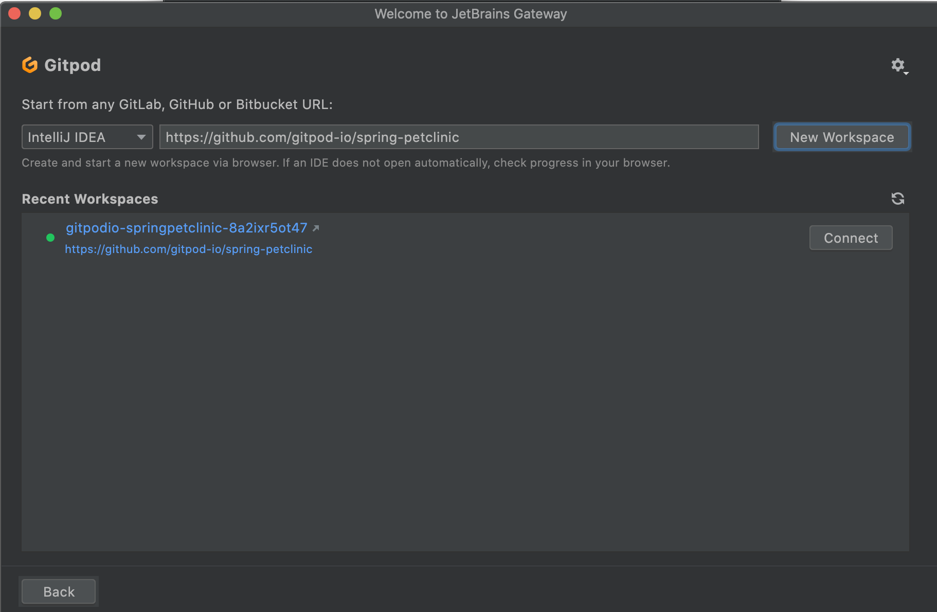 Gitpod 在 JetBrains Gateway 中作为插件提供,您可以使用它连接到现有的 Gitpod 工作区或创建一个新工作区并在 IntelliJ IDEA 中使用它。