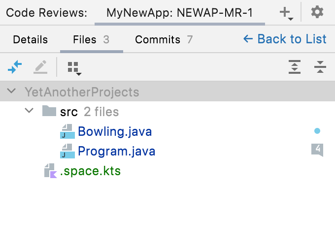 文件:要审查的文件列表。如果文件包含行注释,其计数也会显示在此处。您可以选择一个文件来打开“差异”窗格。
