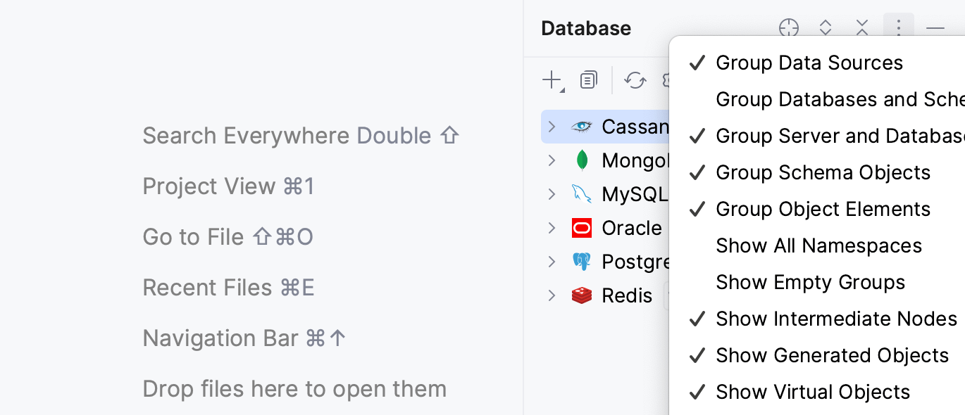 要对数据源进行分组、启用或排序,请单击数据库工具窗口标题栏上的 选项图标 ( ) ,然后选择必要的选项。