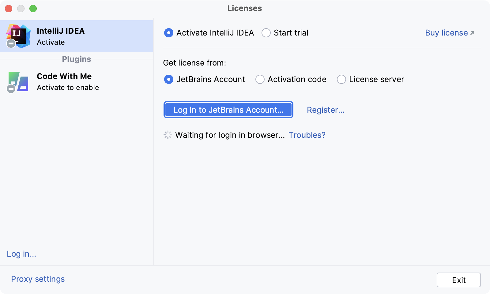 如果您使用 ToolBox 安装 JetBrains 产品并且已经登录,IntelliJ IDEA 会自动将您登录到您的 JetBrains 帐户。