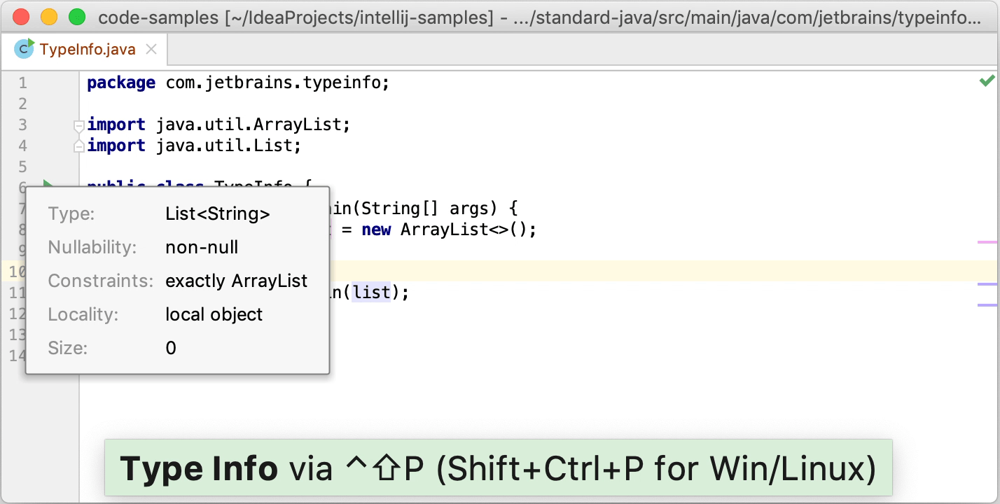 将插入符号放在必要的代码元素处,然后按(或从主菜单中选择“查看 | 键入信息”)。CtrlShift0P