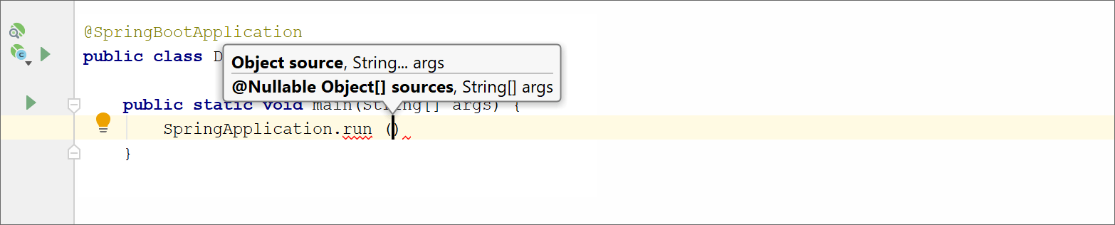 参数信息弹出窗口显示方法和函数调用中的参数名称。在编辑器中键入左括号或从建议列表中选择方法后,IntelliJ IDEA 会在 1 秒(1000 毫秒)内自动显示包含所有可用方法签名的弹出窗口。