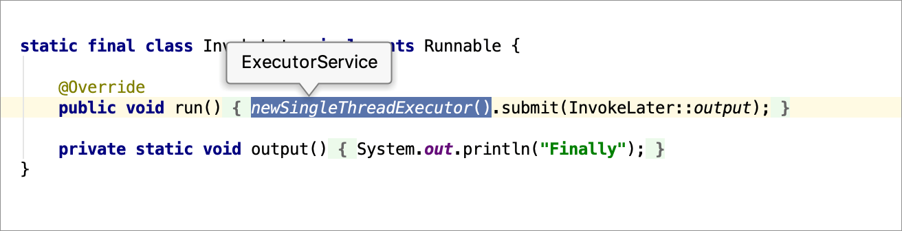 IntelliJ IDEA 允许您在编辑器中查看有关任何 Java 表达式的静态已知信息。此信息可帮助您理解具有大量分支的复杂代码,并详细说明表达式类型信息。